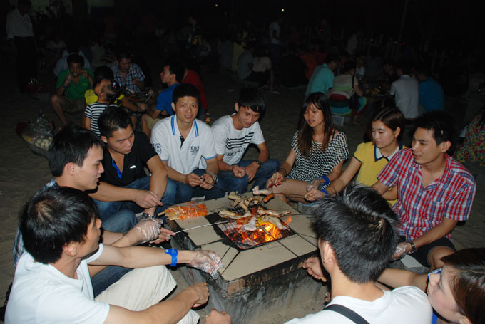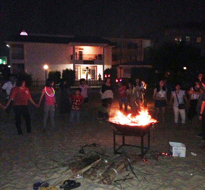 沙滩篝火晚会中: