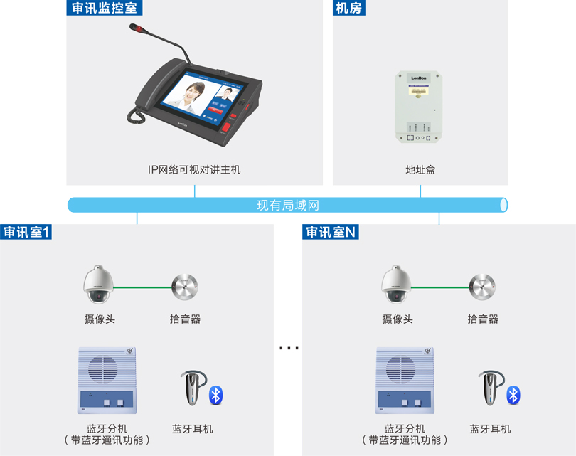 db旗舰官网审讯对讲系统 基于IP网络音视频通讯技术,可通过蓝牙耳机接收远程语音指令,可通过分机一键报警到监控室主机进行可视对讲。系统采用db旗舰官网自主知识产权的数字音视频技术,彻底解决了网络对讲时的回音、啸叫。视频采用H.264,广播采用MP3、通话采用32K音频采样。
