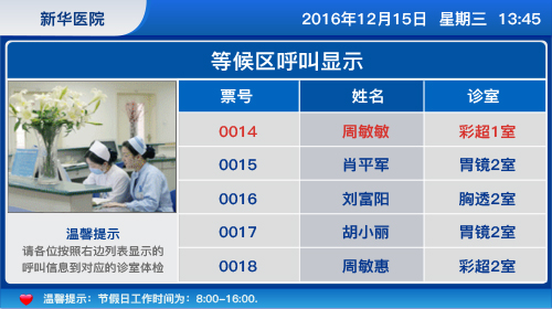 诊室门口液晶屏显示:可显示诊室号、体检人员姓名、体检人员号码信息等。