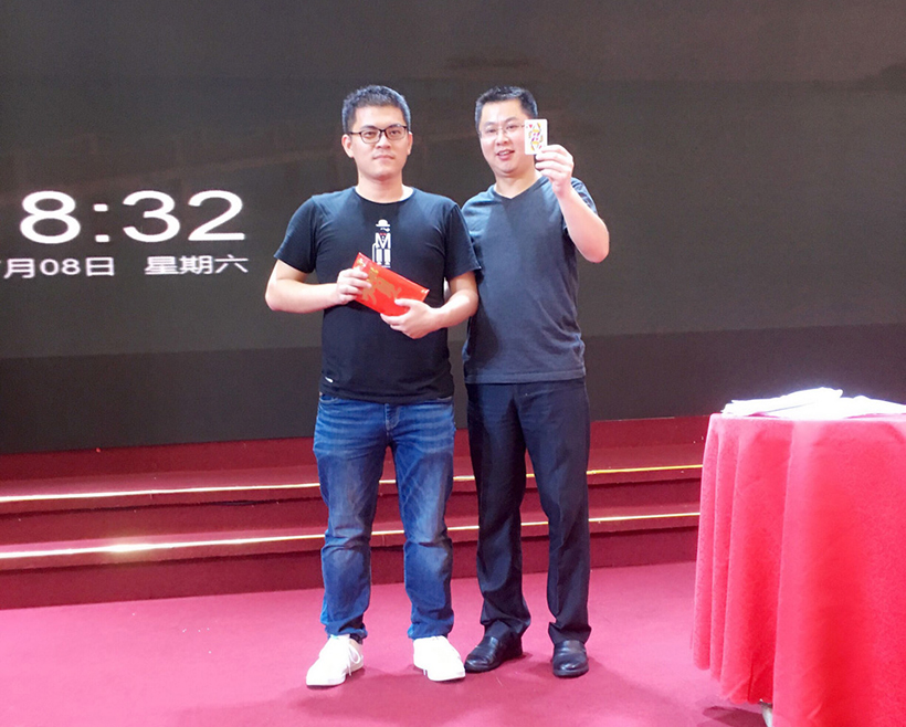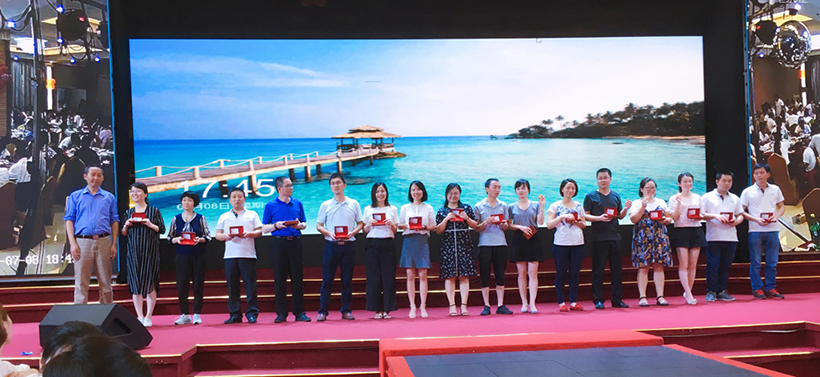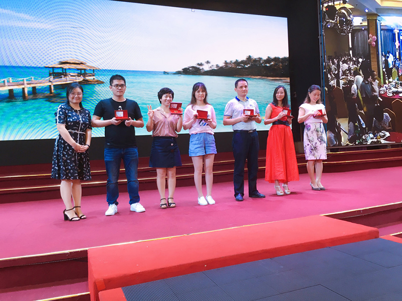 庆典现场,公司分别表彰了工龄超过10年、15年的优秀老员工,副总经理李秋生、副总经理戴露军、财务总监阮文、董事长潘晓亭分别为获奖员工颁发了价值5000元、8000元的纯金奖章。