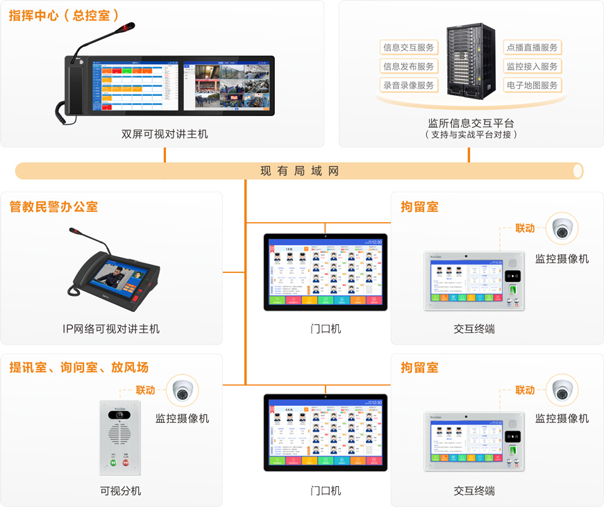 监室智能交互系统主要包括监室内交互终端、监室外管理终端,供监所民警和在押人员使用,具有可视对讲、信息展示、交互管理、信息采集等功能,并支持与实战平台对接。
