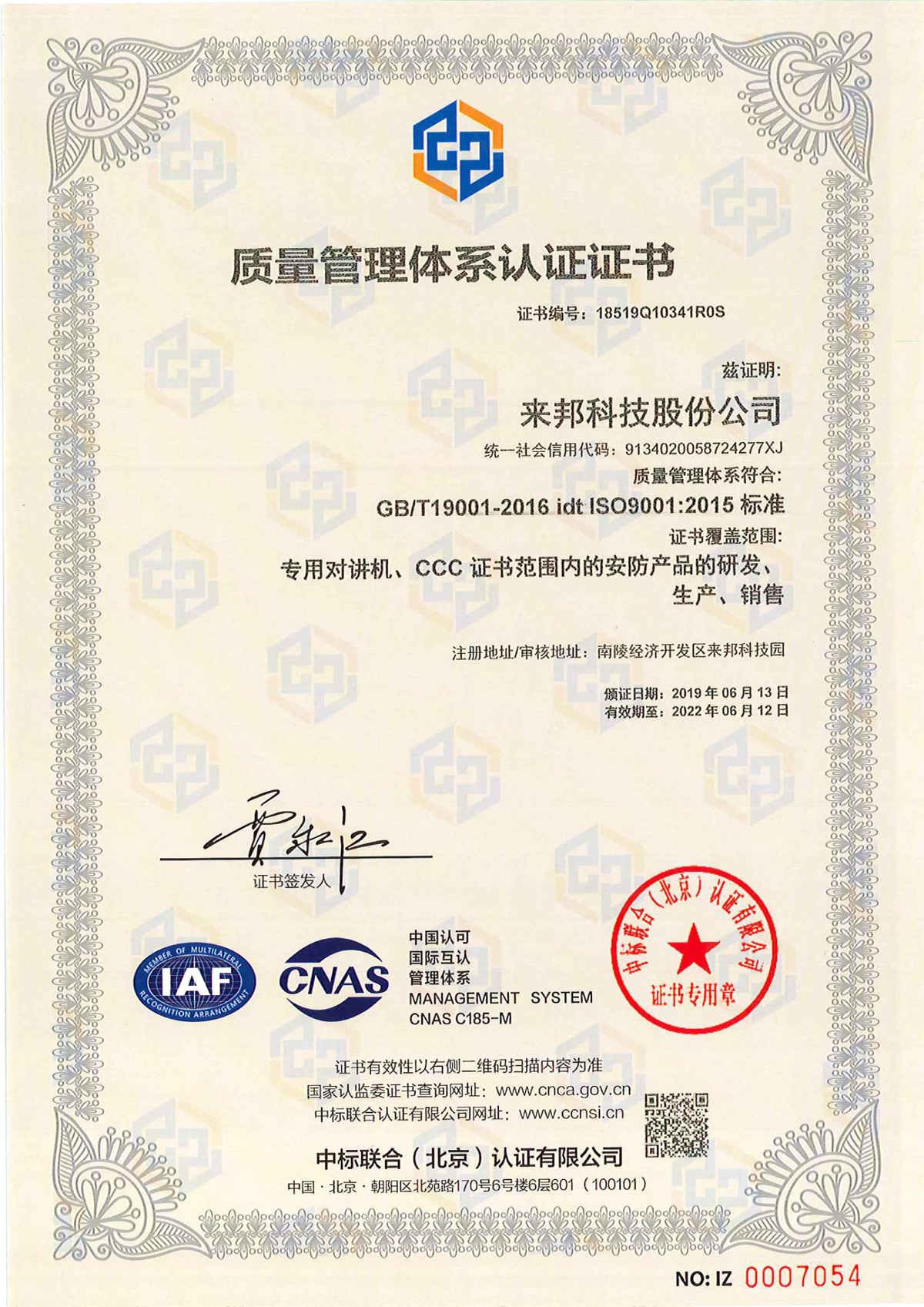 ISO质量体系认证证书