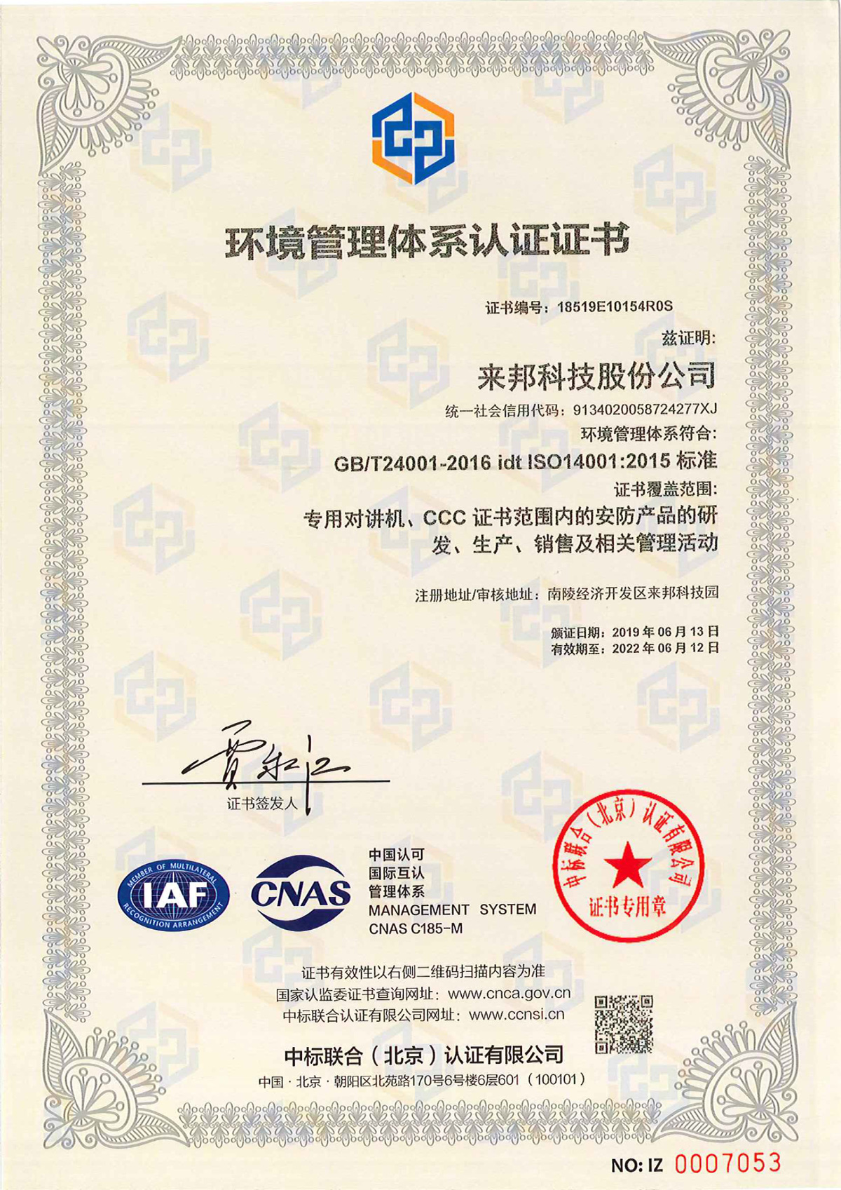 环境管理体系认证证书
