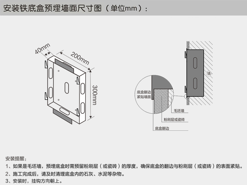 安装铁底盒预装墙面尺寸图。