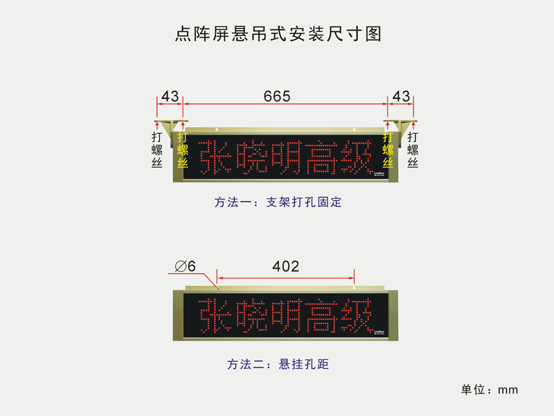 铝合金边框,双面单行五汉字滚动显示,吊装在病区走廊。