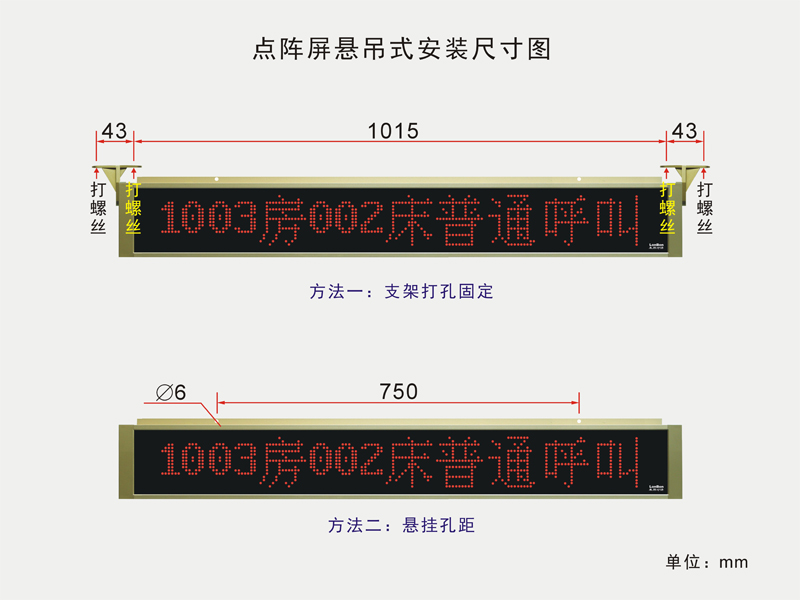 铝合金边框,双面单行十汉字滚动显示,吊装在病区走廊。