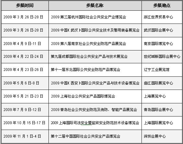 新闻中心 《第九届成都国际社会公共安全产品与技术展览会》将于2009年4月22日-24日在成都举办,届时我公司参加,欢迎新老顾客莅临、参观指导。